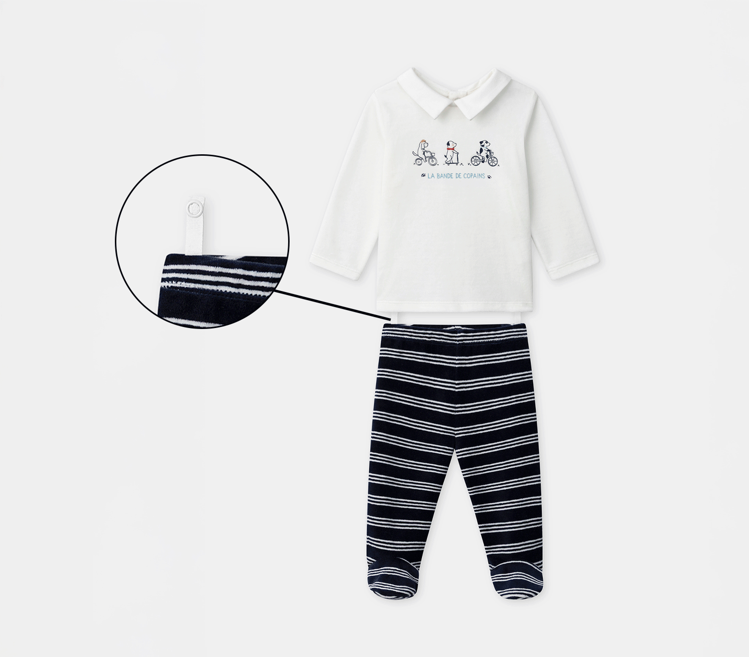 Pratique et rassurant, il facilite chaque change, même au cœur de la nuit. Placées stratégiquement dans le bas du dos, les pressions permettent d’accéder rapidement à la couche sans retirer tout le pyjama, pour un geste simple et tout en douceur.