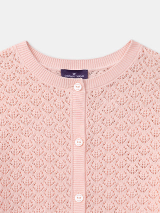 Ce gilet accompagne les enfants calmes et sensibles lors des journées fraîches de mi-saison. Tricoté en maille fantaisie, il présente une coupe droite avec ouverture boutonnée sur le devant. Sa teinte rose douce apporte une touche chaleureuse et intemporelle aux tenues du quotidien.