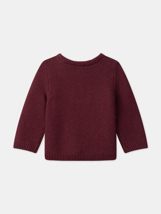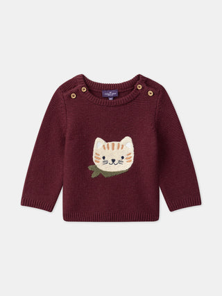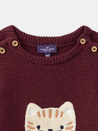 Ce pull est agrémenté d'un patch chat en bouclettes dans des tons doux de beige et kaki. Il dispose d'une ouverture de col par des boutons en bois, ajoutant une touche naturelle et rustique à son design.
