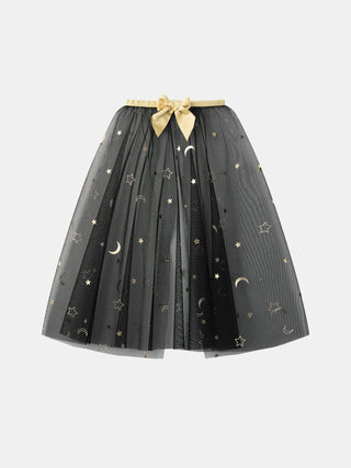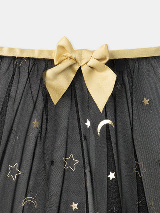 - Cape en tulle noire, imprimés étoiles et lunes dorées