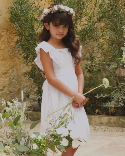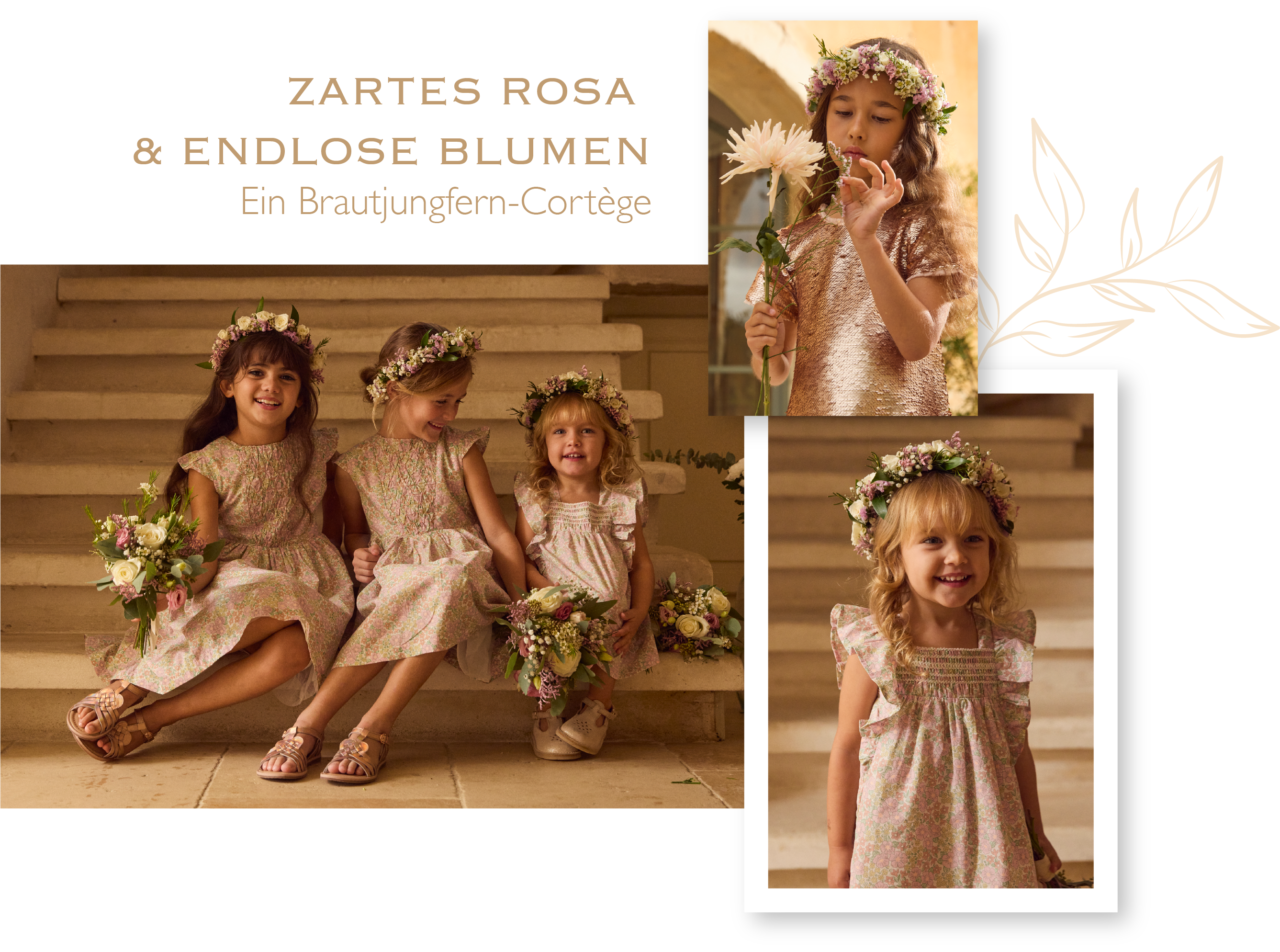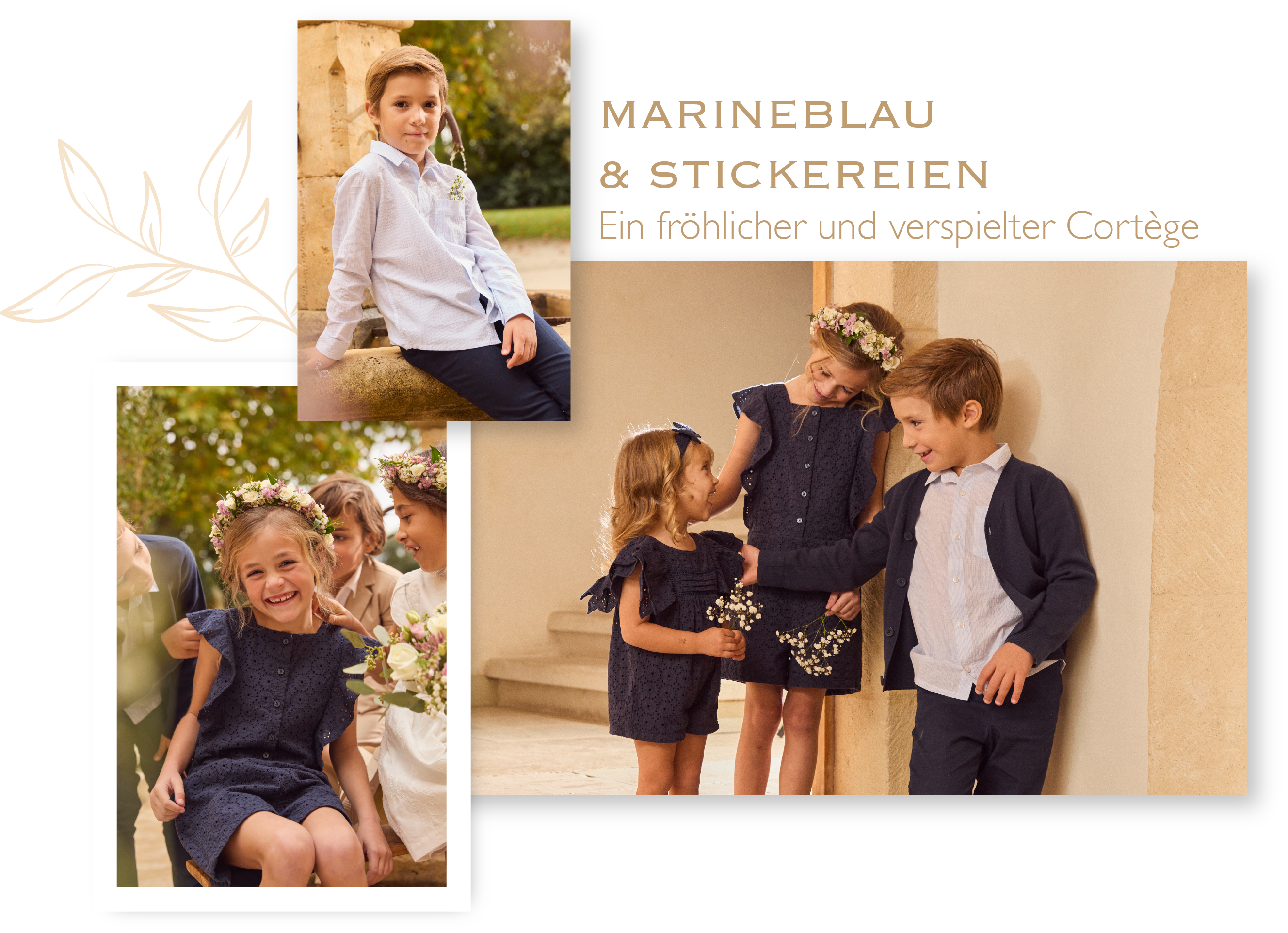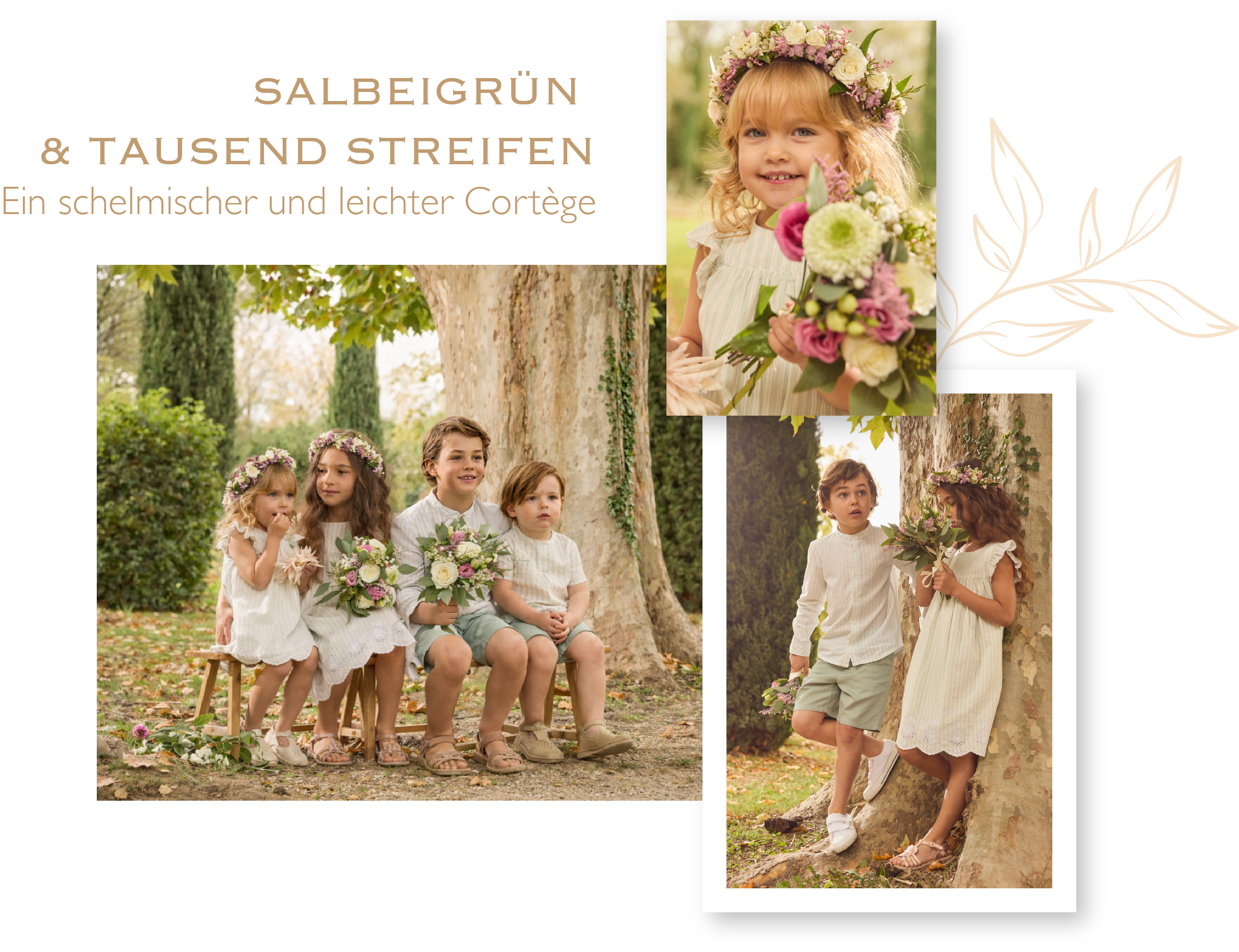 Die Mädchen tragen weiße Kleider mit feinen Stickereien, während sich die Jungen durch dreiteilige Anzüge in Cremetönen auszeichnen, bestehend aus Weste, Sakko und langer Hose.