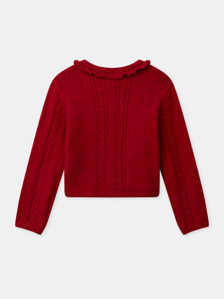 Für kleine Mädchen voller Charme, ideal für milde Jahreszeiten. Dieser rote, luftige Strickcardigan ist leicht und zart und hat einen eleganten Volantkragen. Seine luftige Textur sorgt für Komfort und Stil, perfekt zum Kombinieren mit allen Outfits.